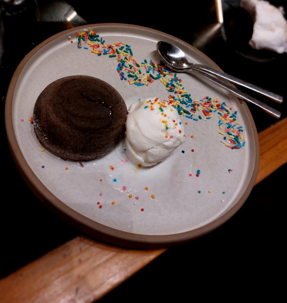 The ice cream was ice cold, i did get some ice flakes over it but it didn’t decline the taste of the ice cream which was delicious but the main thing was just about to enter our dining The Molten Lava Fudge. As it arrived my eyes were amazed by the plating, the choice of the plate colour, the rainbow sprinkle border, a small sphere cake which appeared to be a soap by my camera when I was clicking pictures of it and last but not least two scoops of vanilla ice cream. All of this was like a dream I never saw but was in front of my eyes coming true.