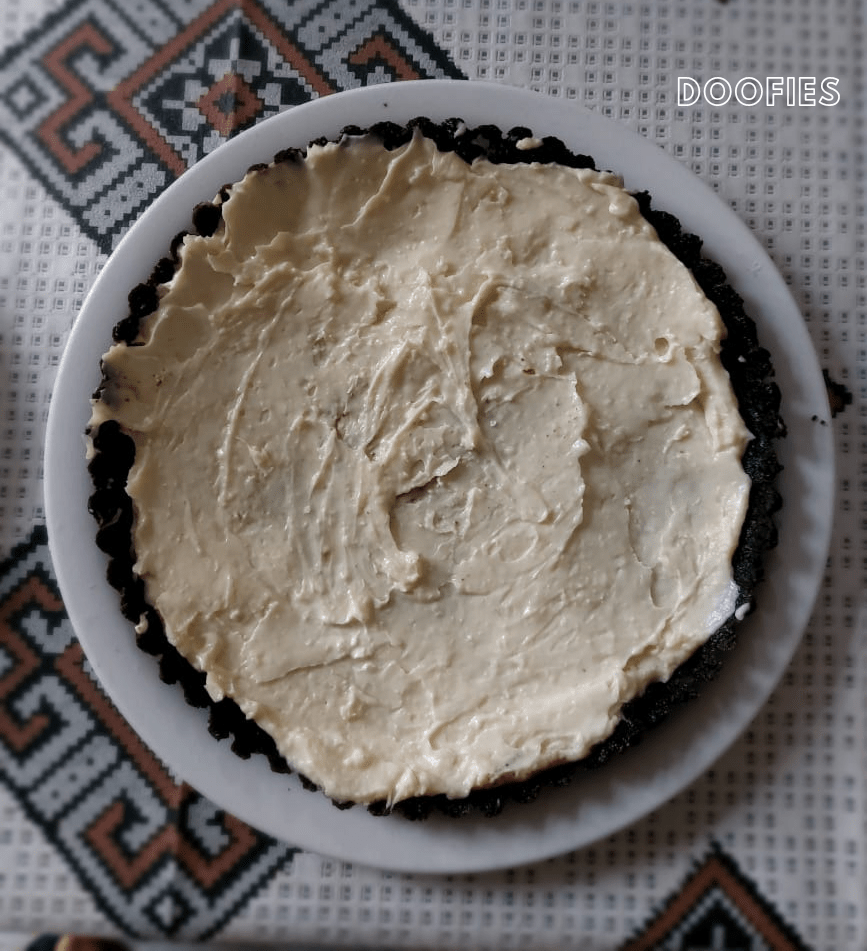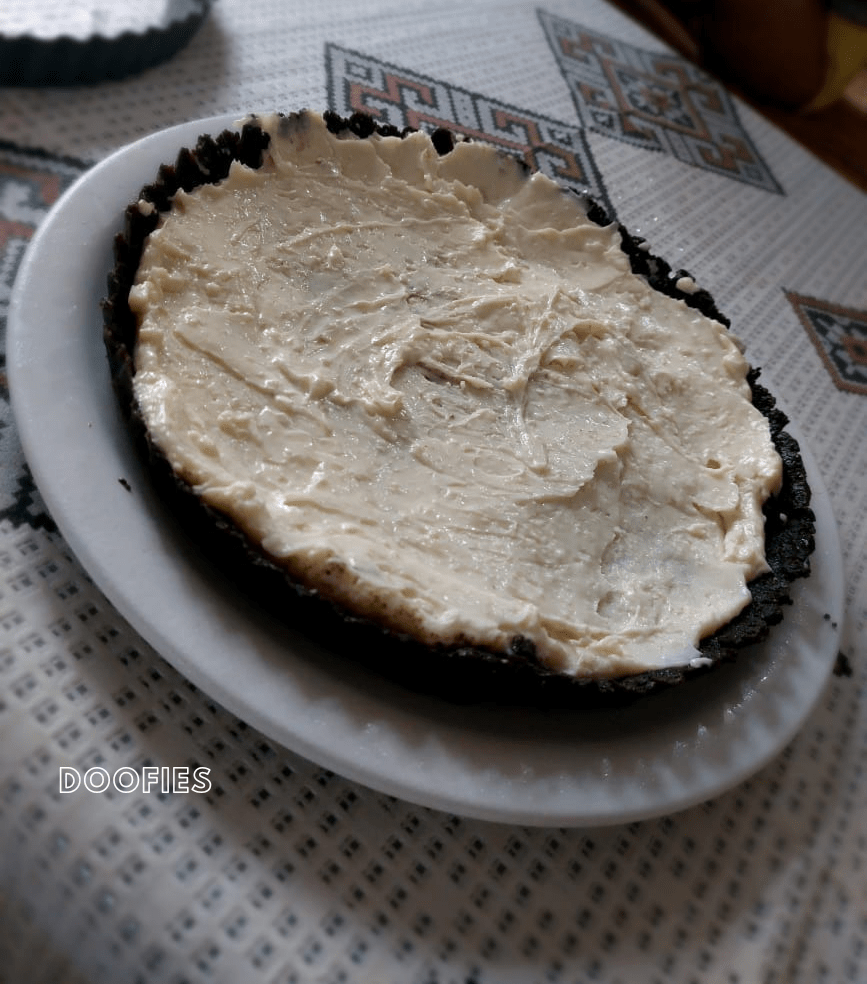 The very moment I went on youtube to look for a recipe to make such a tart. I was in a dilemma at that time because at that time I had already thought of how to make the tart, what will be the white part representing the cream and the black base representing the biscuits, so I was confident enough that no recipe video with such a video would be available on youtube.