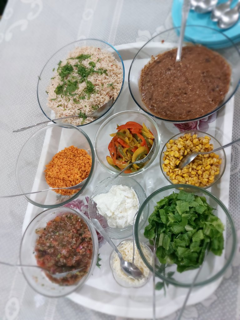 After some time she arrived in the dining room with sauteed bell peppers, fried rice, kidney beans, corn and crushed nachos, and crunchy iceberg lettuce.