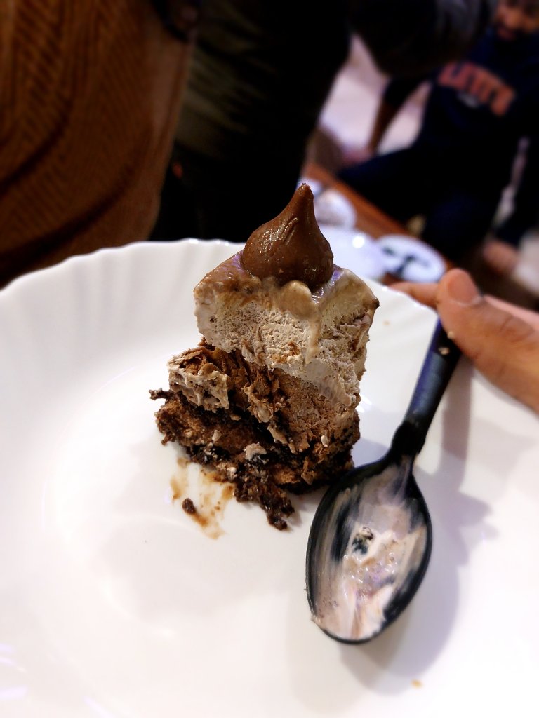 The crumbly brownie texture below with the caramel chocolate ice cream in the middle mixed with nougat was tasting godly delicious! and the last but not the least the last kiss of the cake which was on my cake slice was eaten by me separately after finishing the whole slice.