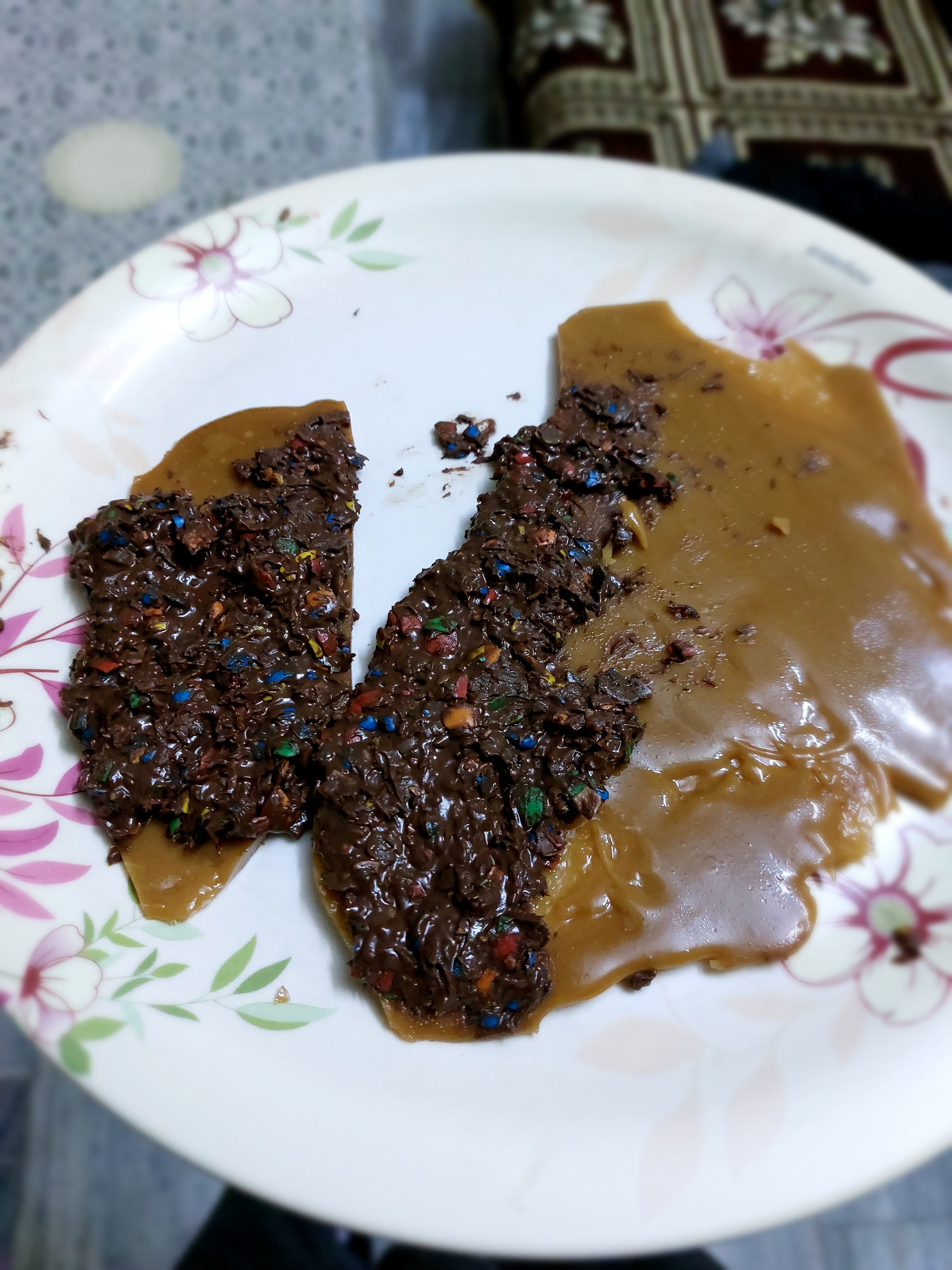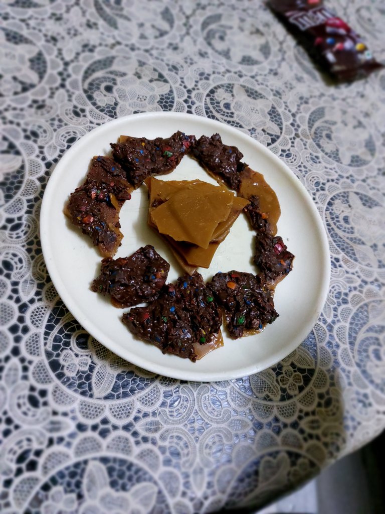 In my case, I desired to cut it down in equal rectangle shapes but the chocolate didn’t spread over the toffee properly because some pieces were large enough for the chocolate to spread so I cut it into smaller pieces and tried to spread the chocolate with some colored chunks at the top of the chocolate and stacked some toffee bars on the sides and some in the middle and looked turned to be looking amazing for me like a mini dessert bonfire but here the fire signifies the taste of the toffee chocolate bars which was flamingly good.
