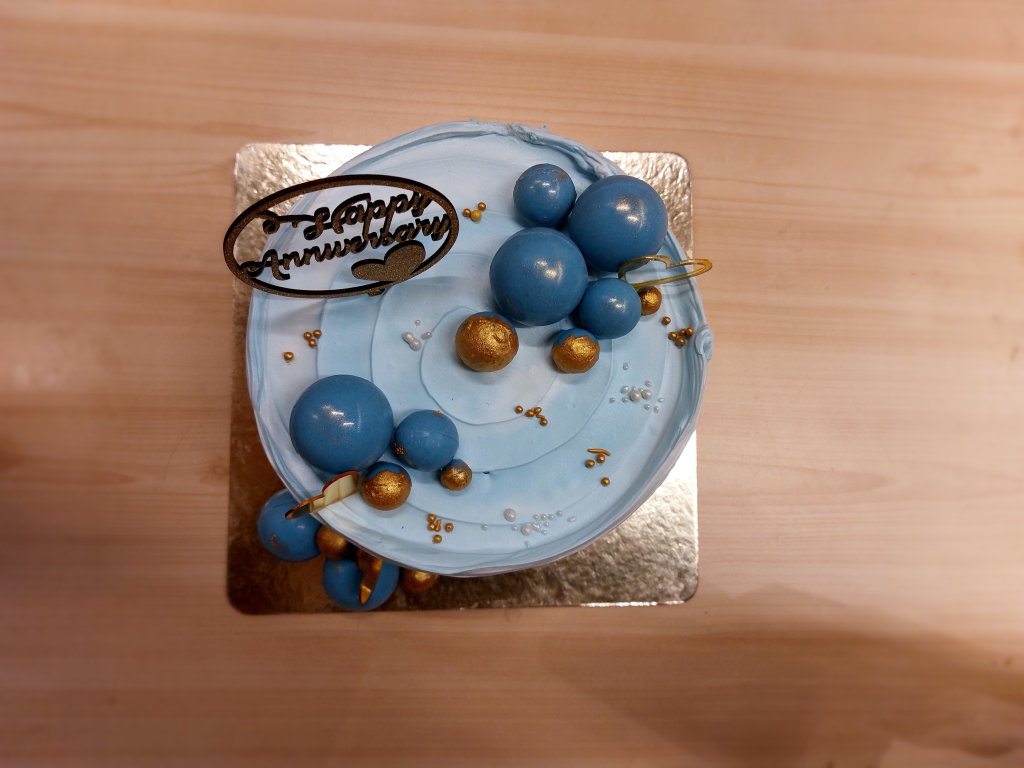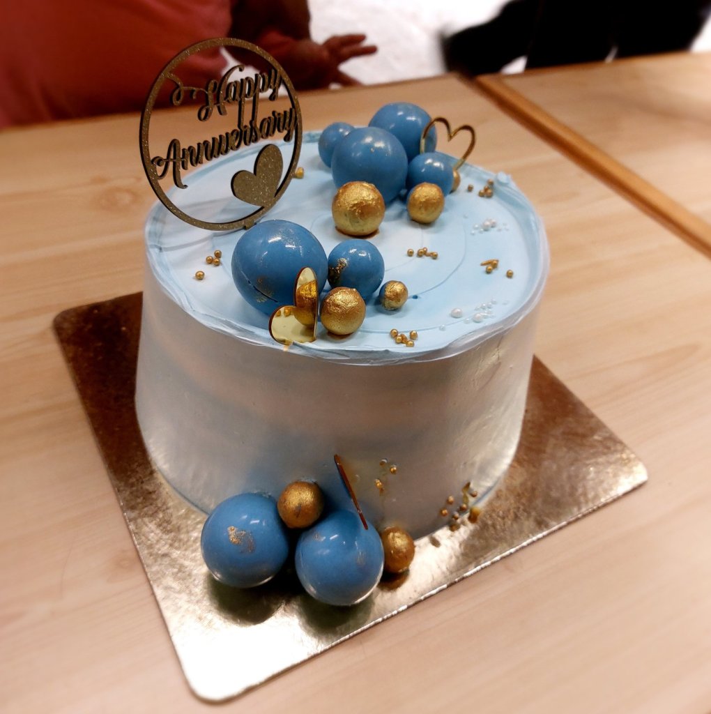 So to begin with, the cake definitely was a beauty, one that makes you swoon over and fall in love at the sight. This was a watercolor buttercream cake. In this technique, buttercream of complementing colours is smugded with an offset spatula on the cake and then it’s evenly smoothened. The harmony of cyan and white with a tinge of shimmery golden was an eye-catching colour palette. So the balls adorning the cake are made of white chocolate. When cut the cake comprised fluffy sponge and pastry cream with blueberry coulis. A coulis is different from a jam because the latter has a thicker consistency. The flavors were endearing. Not overpowering, just subtle.