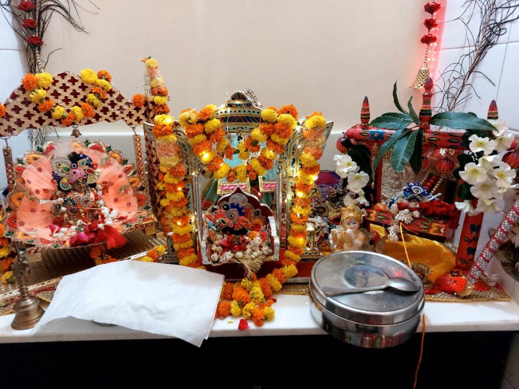My home temple was decorated with blue colored balloons, and jasmine flowers Lord Krishna got up ready in new clothes, crown with a flute in his hand relaxing on his swing. A giant red colored balloon filled with candies was a sticker to the ceiling to burst with a needle at exactly 12 am when our baby Lord arrives in our world.