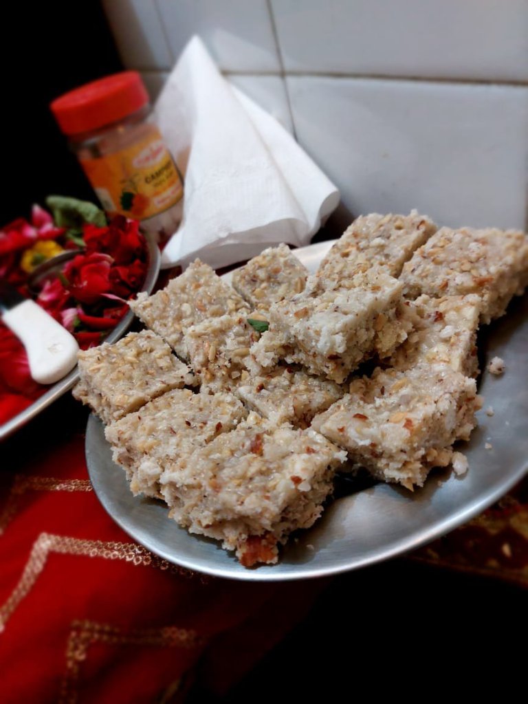 Janmashtmi preparations start from preparing prasad early morning, roasting coriander seeds, almonds, and fox nuts in desi ghee grinding them together with sugar mixed in it, and garnishing them with coconuts flakes. Maa made another sweet this year for Janmashtmi using cashews, almonds, fox nuts, and coconut flakes shaped in squares using melted rock candy garnished with crushed rock candy bits.