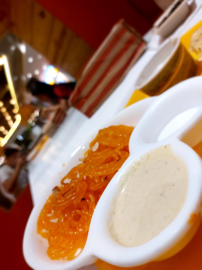 It hit me afterward that actually both dosa and jalebi have a common ingredient of rice flour in use which made this combination even more special. Dosa was complemented with its coconut and red chutney whereas jalebi had rabdi with it, generally, jalebi can be had dipping in the rabdi or rabdi poured on the jalebi, honestly, I wanted the poured version to try but once jalebi arrived I was mesmerized and as soon as possible I dipped the jalebi in rabdi and it was not a regret to follow since I packed some jalebi for home and there I tried the poured version where it looked just like pearls so pretty and delicious at the same time.