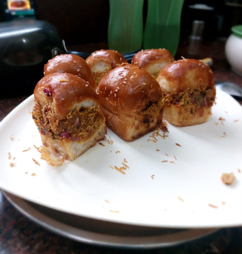 It has beautiful layers of flavour hidden beneath the sweet and savoury bun of mashed potatoes mixed with sweet and spicy sauce with a savoury crunch of bhujiya end with the grand finale of sweet and refreshing pomegranate crunch !